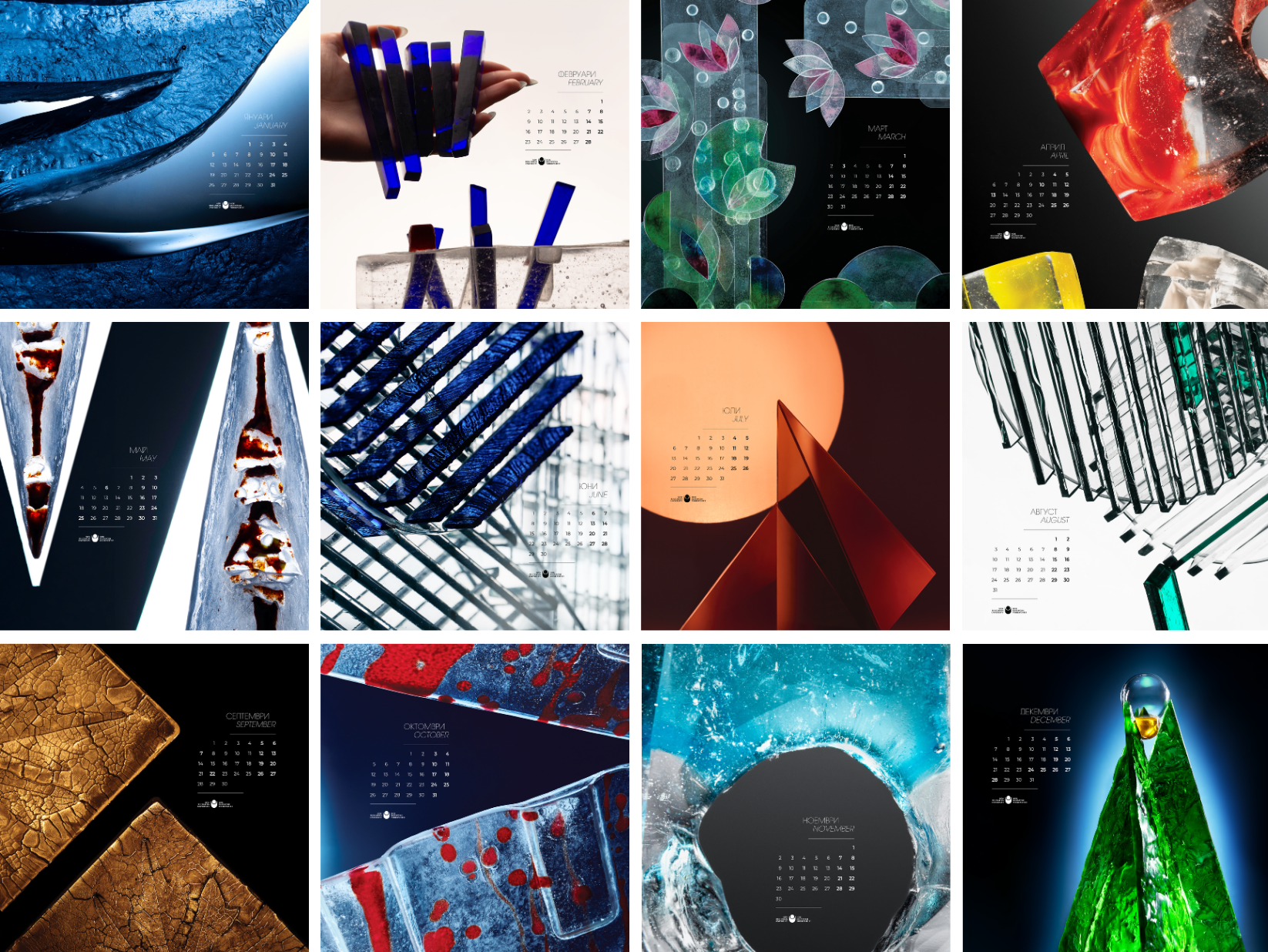 С гордост ви представяме резултата от вдъхновената работа на нашите талантливи студенти от Ателието по стъкло и програма „Фотография и видеография“, които създадоха уникален календар. Темата тази година е „Кристален визьор“, а идеята за нея идва от студентски клуб по интереси „Фоторафска работилница“.